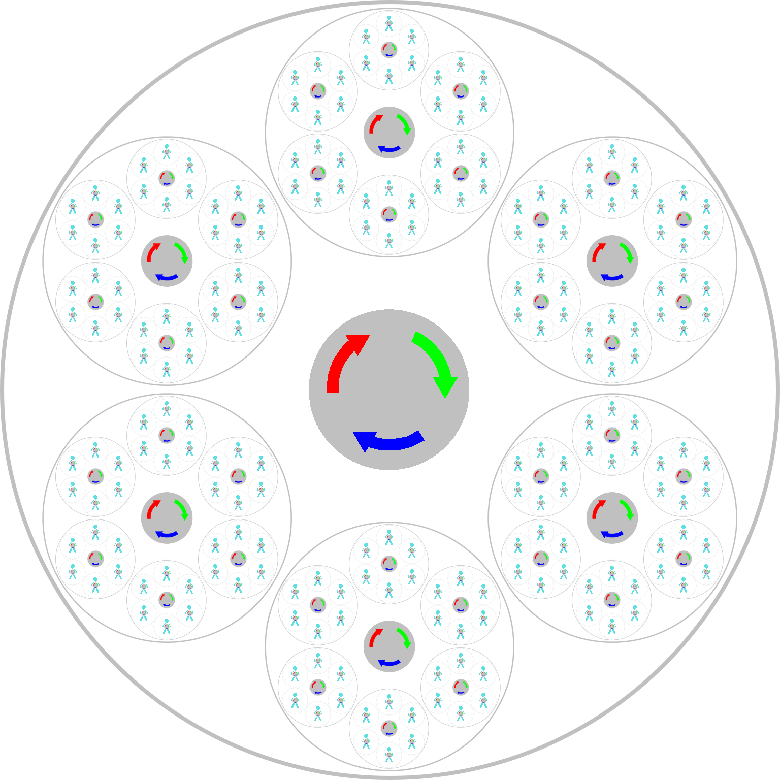 Each grey circle delimits a Selfed. Each grey dot with circling arrows is a Self Sustainment System.